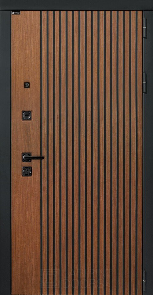 Фурнитура в черном цвете: Броненакладка врезная, накладка со шторкой, глазок , дверная ручка, ночная задвижка. Цилиндр ключ-вертушка Apecs, регулируемый эксцентрик.